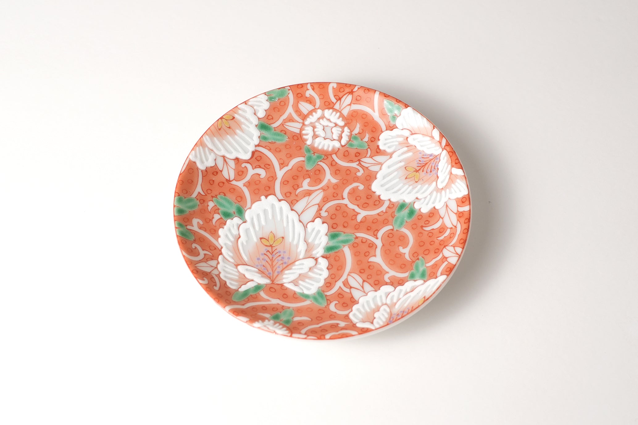 This elegant small plate features delicate calligraphy and a Manyo flower design. The intricate coloring of Kutani Akae paint reflects the poetic sentiment and aesthetic sense of Japan.