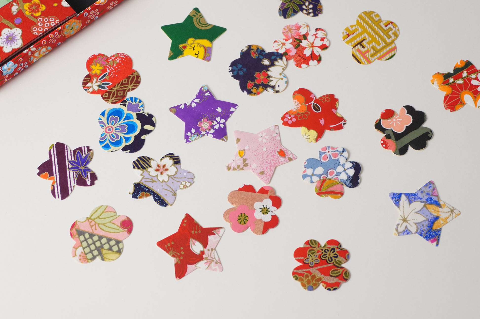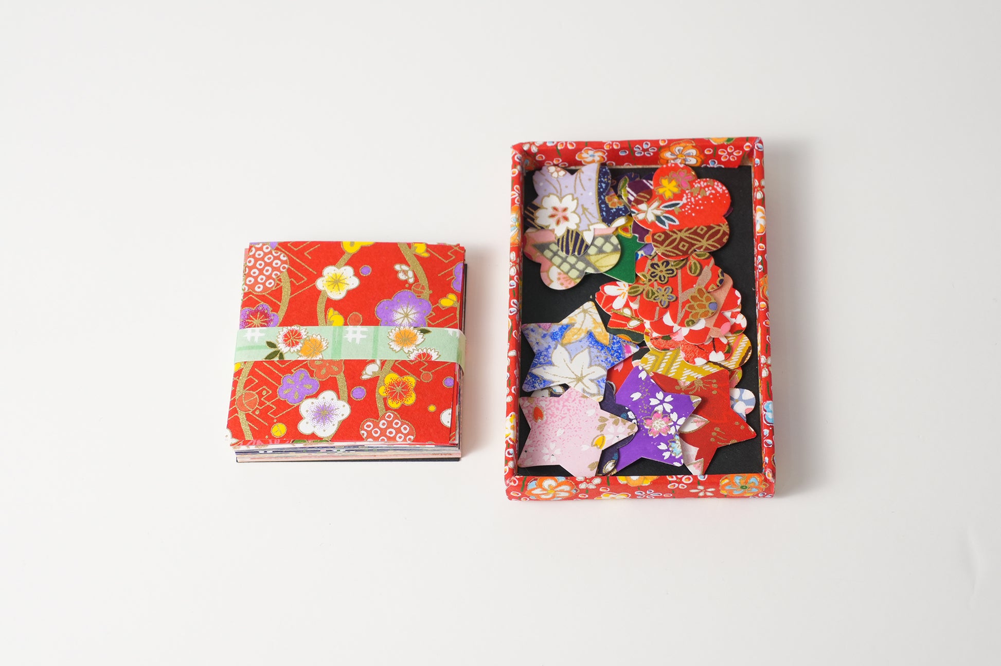 A set of beautiful yuzen washi chiyogami paper and stickers. 50 sheets of chiyogami (6 cm square) and 20 Japanese star-shaped stickers are packaged in a box with yuzen washi paper pasted on it. It is a perfect souvenir for homestays and overseas business trips.