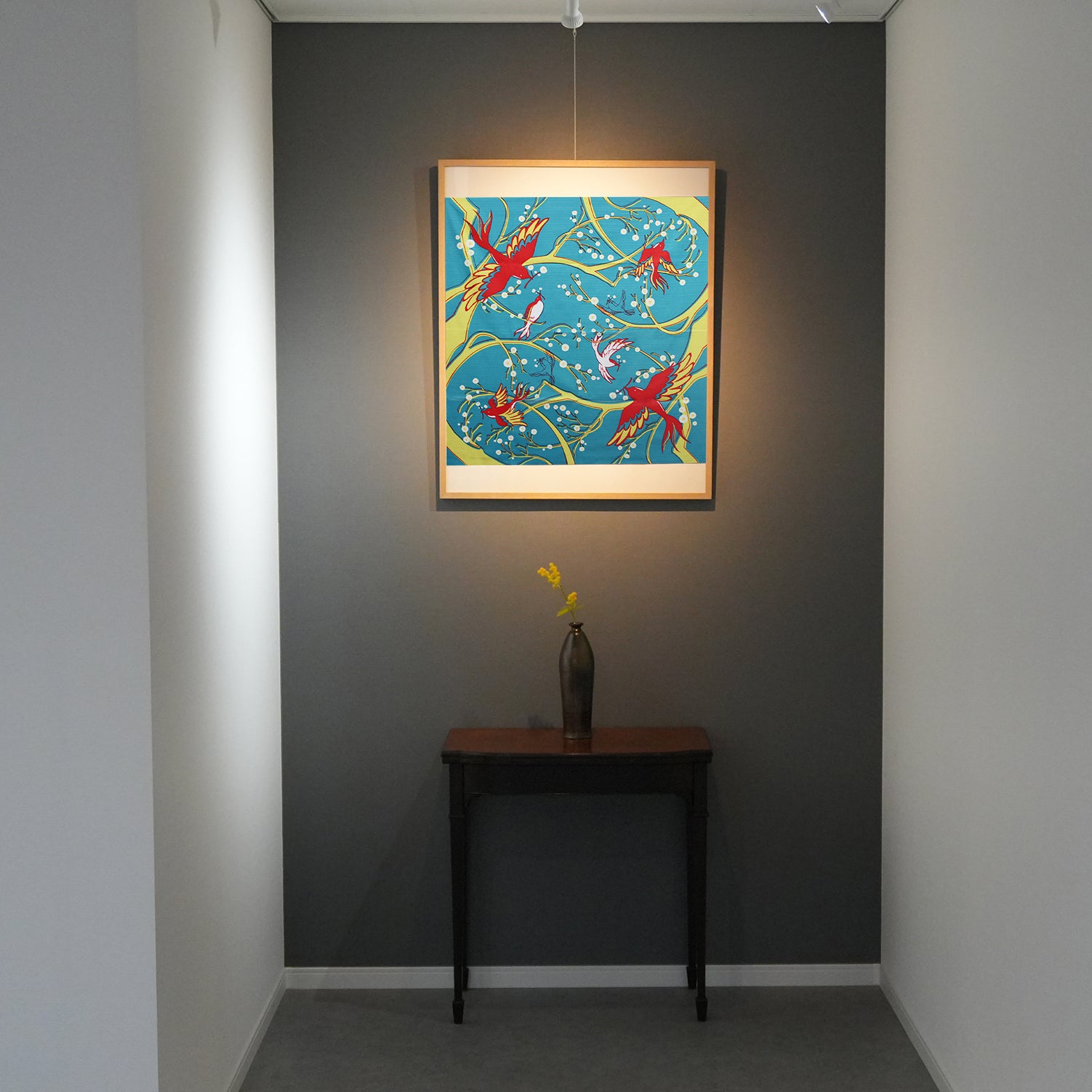 This furoshiki is approximately 90cm in size. It was created in collaboration between mashu and artist Miki Ueno. Since ancient times, the image of a bird holding a flower branch in its mouth has been a symbol of good fortune, flying from paradise to bring happiness, and has been loved by people all over the world as a "flower-eating bird" motif. We have boldly arranged the flower branches and bird of the "flower-eating bird" beloved around the world on this furoshiki, allowing you to enjoy various expressions depending on how you wrap it.