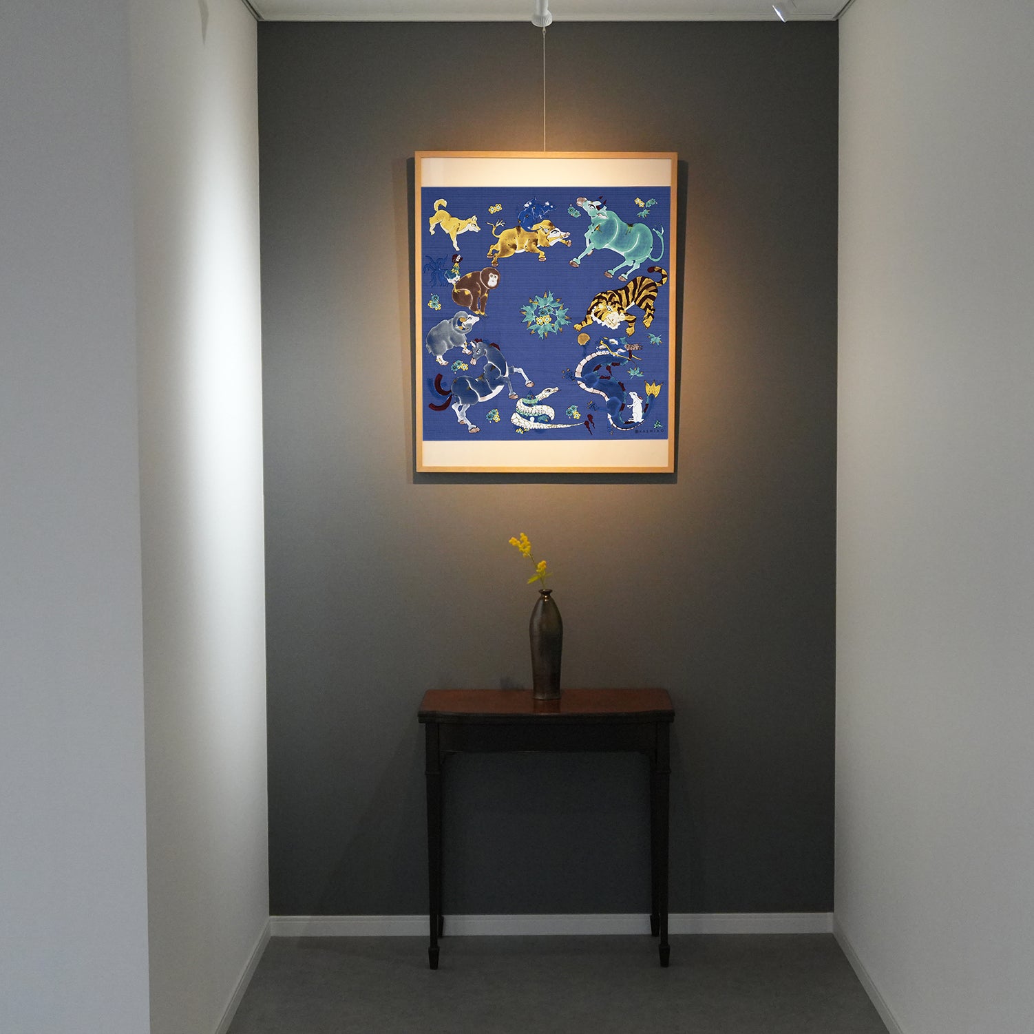 This is an original KASHIKO furoshiki cloth with a motif of the animals of the Chinese zodiac in action, illustrated by Kutani ware color artist Yasushi Yamachika.