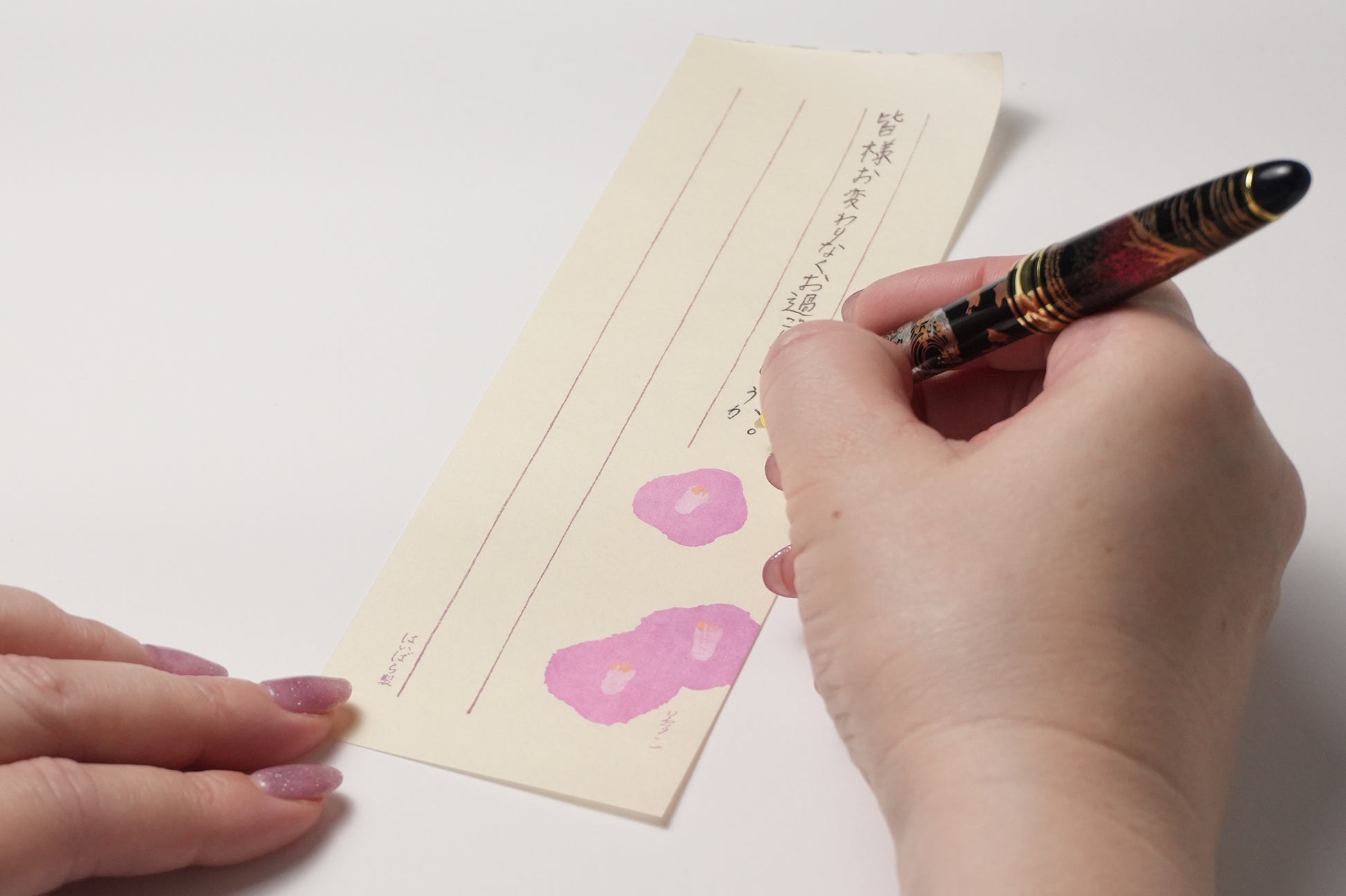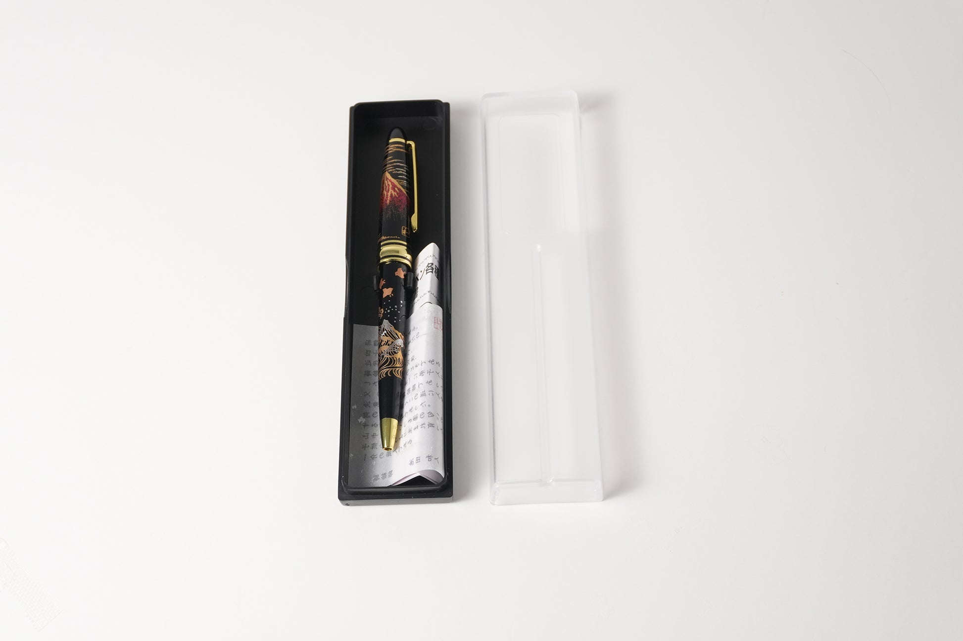 A lacquerware ballpoint pen with a red Fuji motif, finished in Yamanaka-nuri, a traditional Japanese lacquerware technique. The lacquer painting technique of Yamanaka Onsen is harmonized with a modern form to create a powerful yet beautiful pen. Red Fuji is a symbol of "success" and "prosperity. It is an auspicious gift to mark a special milestone.