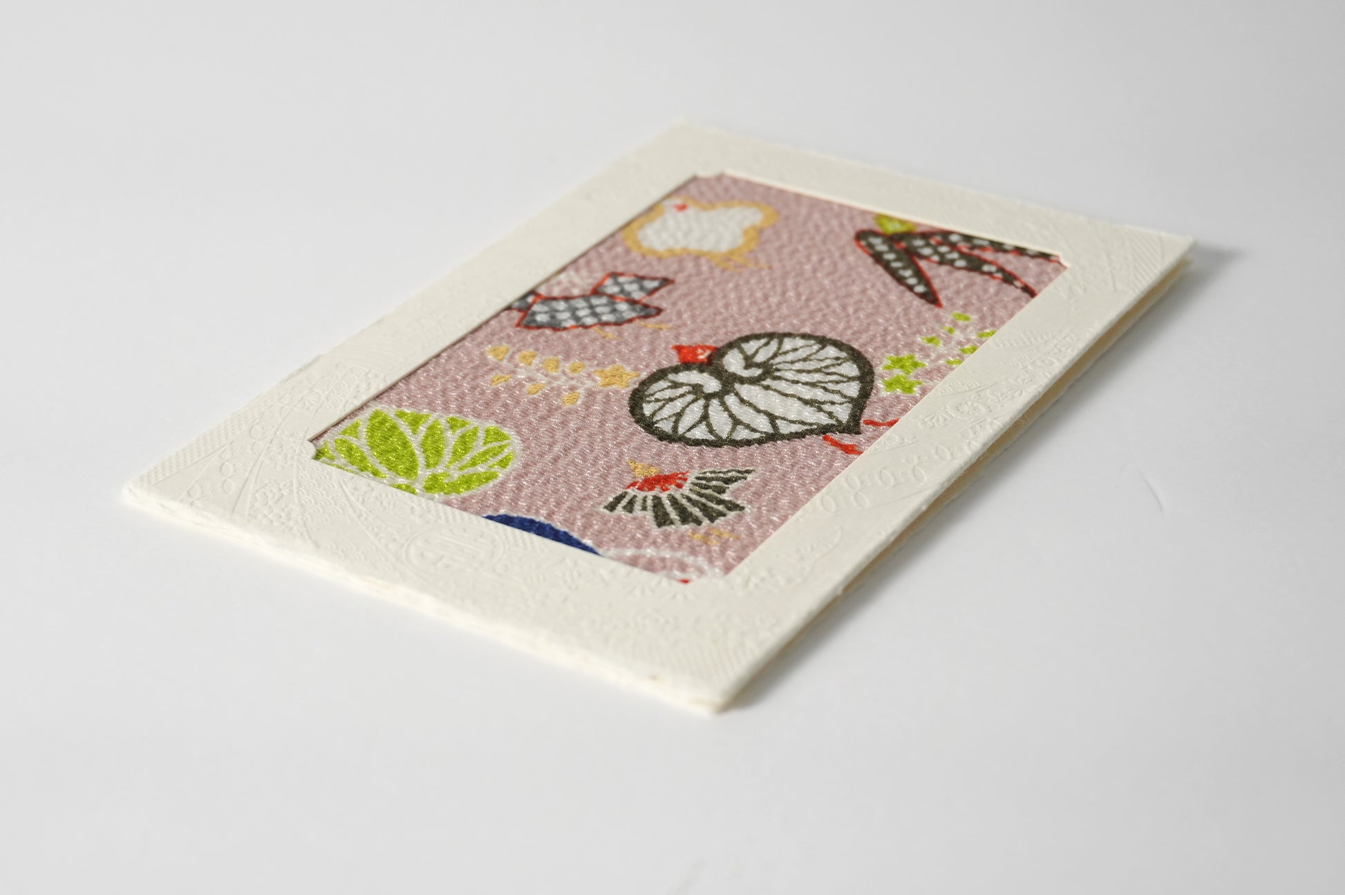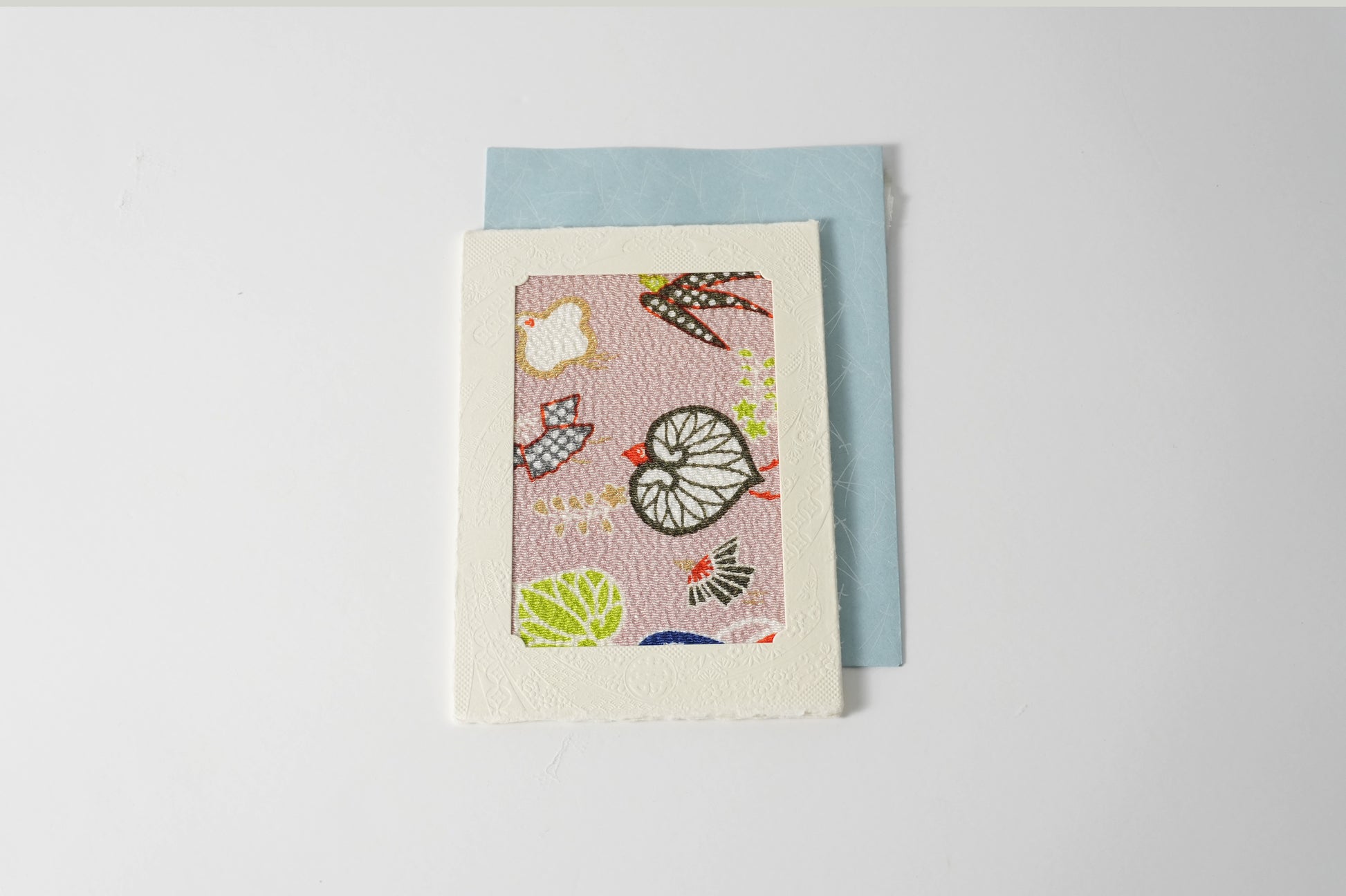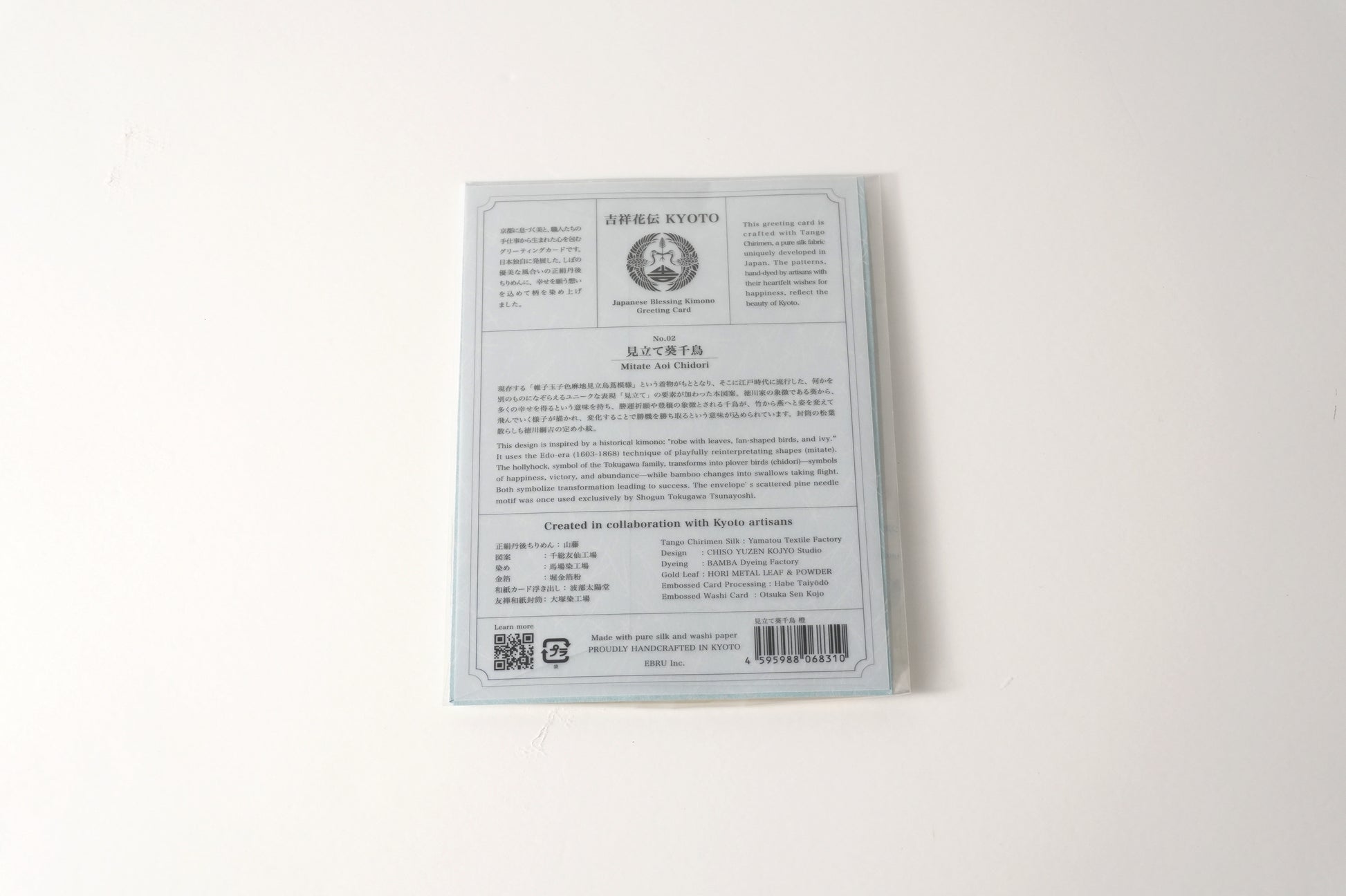 時を超えて受け継がれた京都の美と、幾人もの職人の手仕事を経て生まれた心を包む文化の贈り物のグリーティングカード。 日本で独自に発展した、京都・正絹丹後ちりめんを用い、生地の織り・染めまたカードや封筒などの紙加工まで、京都府内の職人が丹念に仕立てています。日本の伝統文化を感じる贈り物としてはもちろん、特別な日の贈り物にも最適な、日本の美と技を伝える一枚です。一枚の風呂敷から必要なサイズに切り取っているため、柄の出方は一つひとつ異なり、同じものはありません。写真はあくまで一例となりますので、手元に届く一枚との出会いをお楽しみください。【見立て葵千鳥】葵から千鳥、竹から燕へと、その姿を変容することで勝機を勝ち取るという意味が込められた演技の良い意匠。