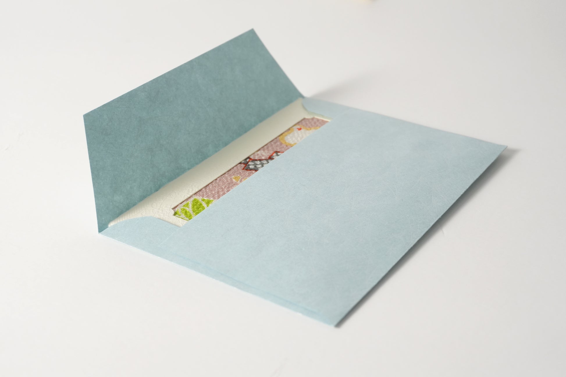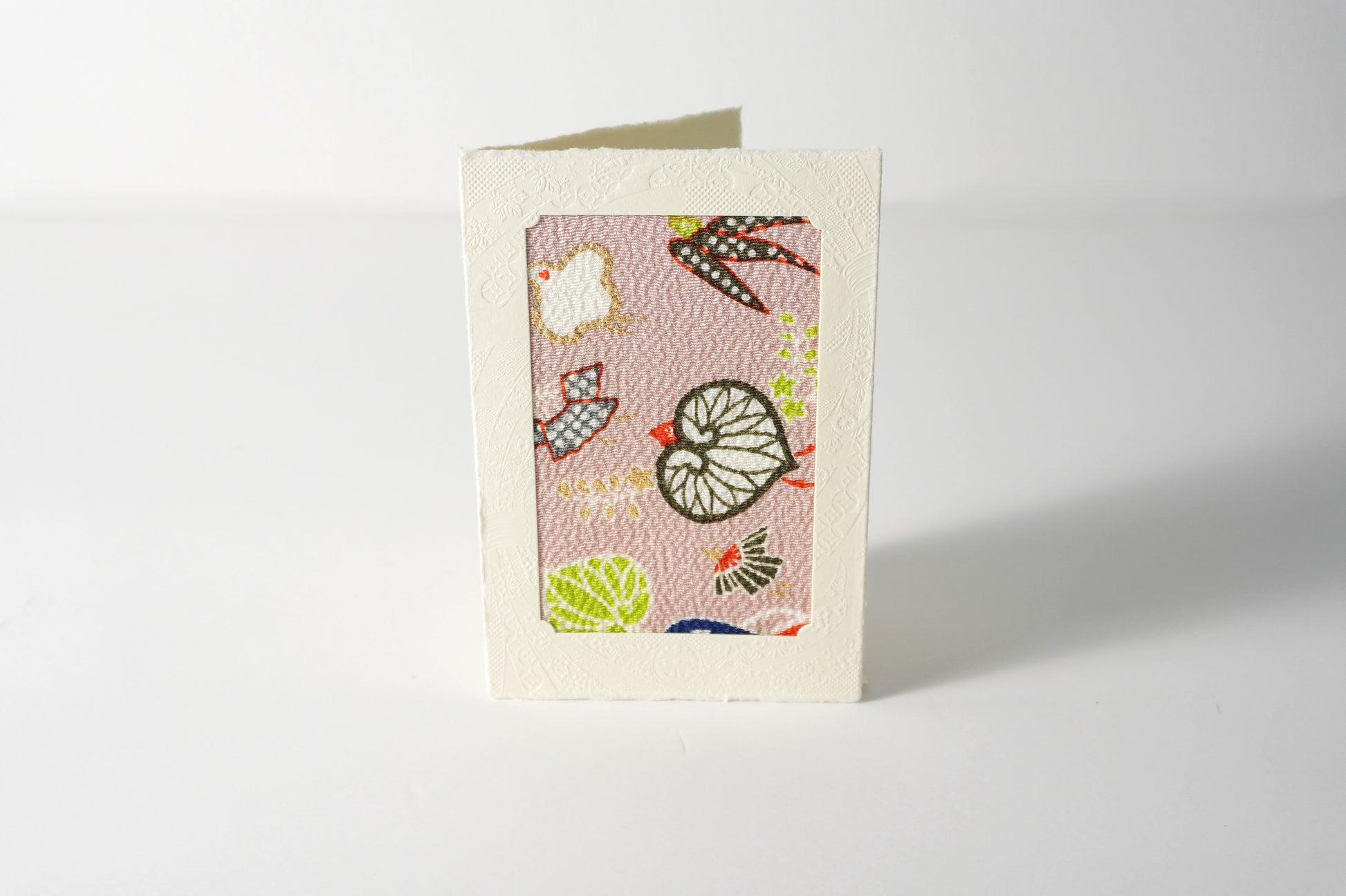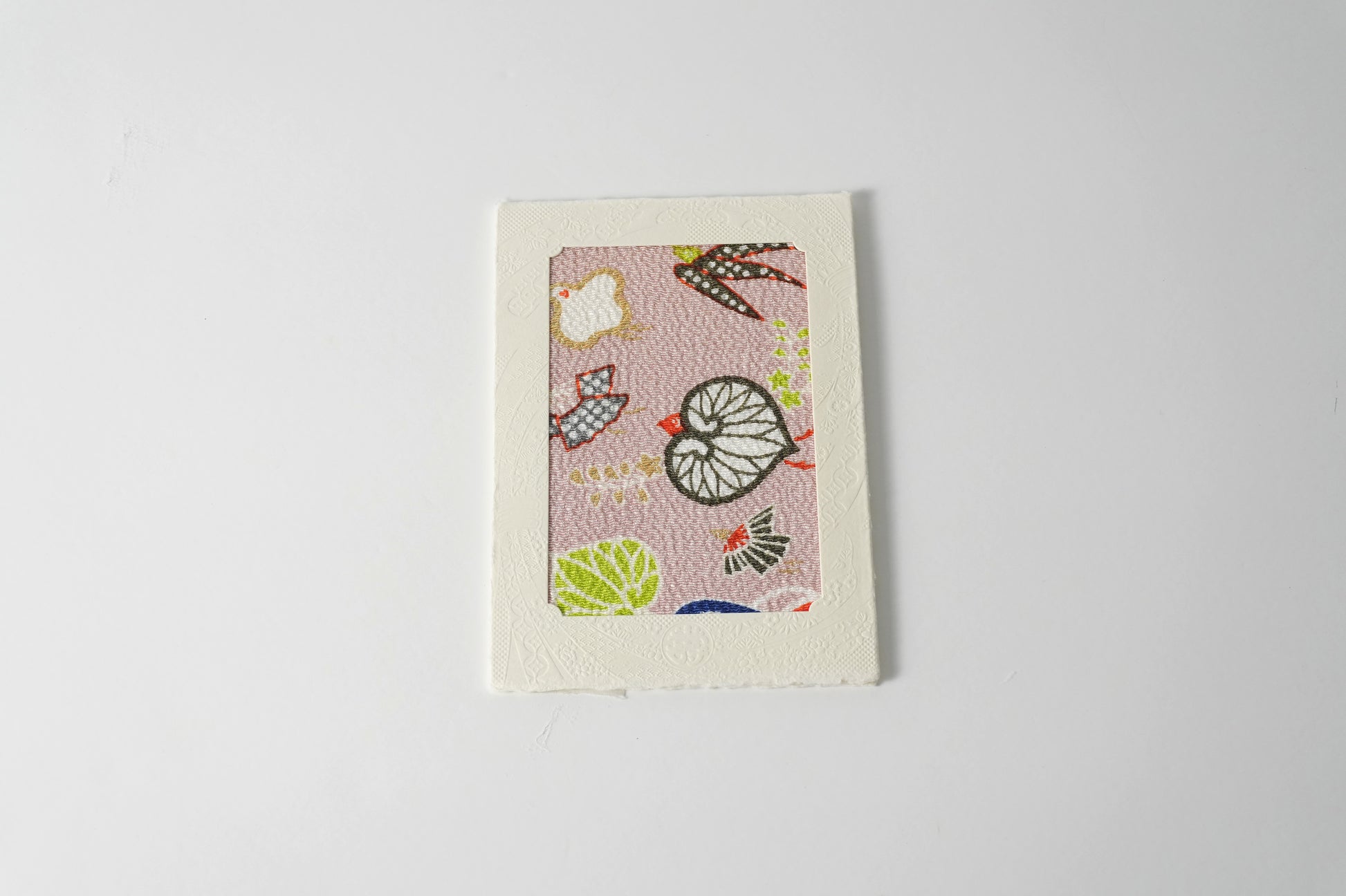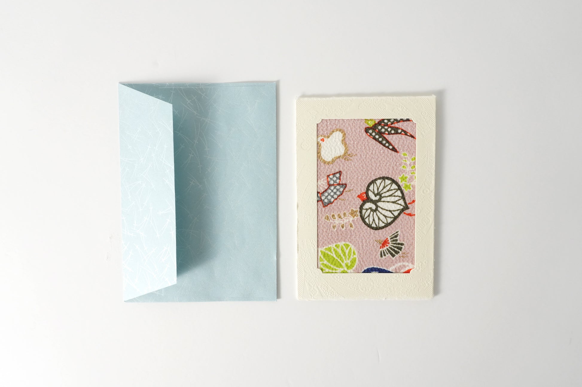 時を超えて受け継がれた京都の美と、幾人もの職人の手仕事を経て生まれた心を包む文化の贈り物のグリーティングカード。 日本で独自に発展した、京都・正絹丹後ちりめんを用い、生地の織り・染めまたカードや封筒などの紙加工まで、京都府内の職人が丹念に仕立てています。日本の伝統文化を感じる贈り物としてはもちろん、特別な日の贈り物にも最適な、日本の美と技を伝える一枚です。一枚の風呂敷から必要なサイズに切り取っているため、柄の出方は一つひとつ異なり、同じものはありません。写真はあくまで一例となりますので、手元に届く一枚との出会いをお楽しみください。【見立て葵千鳥】葵から千鳥、竹から燕へと、その姿を変容することで勝機を勝ち取るという意味が込められた演技の良い意匠。