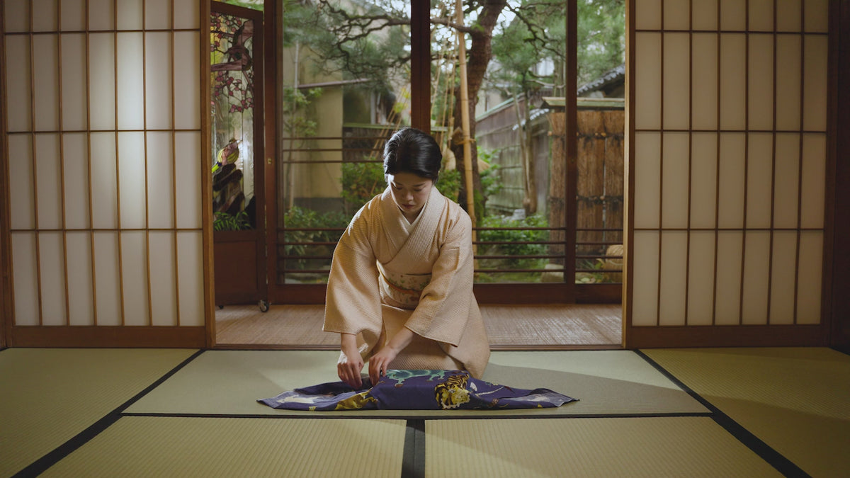 京都で110年続く木造合掌造りの工場の中、 ひとつひとつ手作業で型染めする昔ながらの技術で、 職人が一枚ずつ丹念に風呂敷を染め続けています。