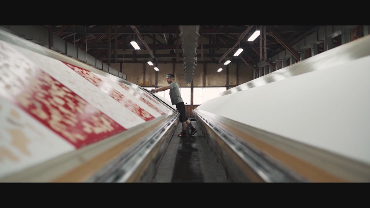 京都で110年続く木造合掌造りの工場の中、 ひとつひとつ手作業で型染めする昔ながらの技術で、 職人が一枚ずつ丹念に風呂敷を染め続けています。