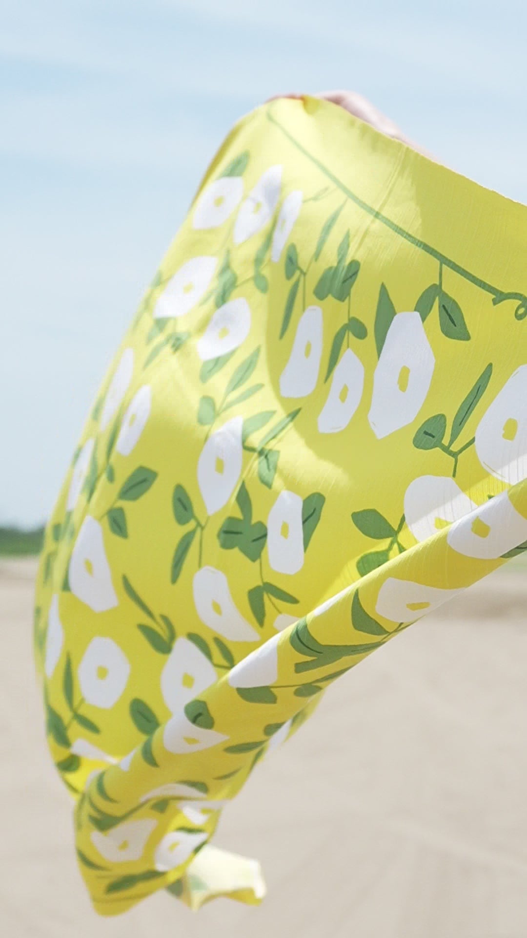 夏の陽ざしに映える、ひるがお柄の風呂敷。 明るい黄色に咲く白い花が、持つ人の心まで晴れやかに。 ビーチや公園で敷物として、バッグに忍ばせて荷物包みにも。