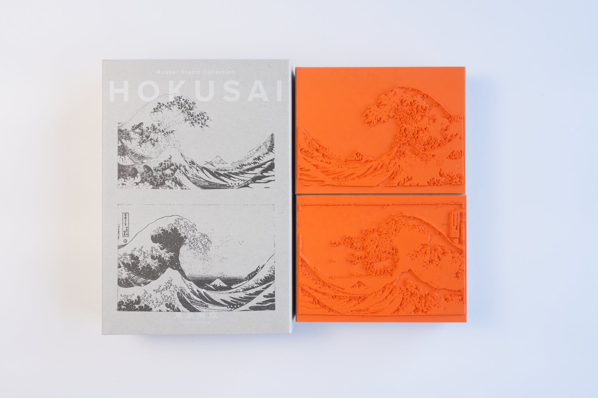 世界に響く大波の迫力を、手のひらに。富嶽三十六景の中でも最も広く知られる『神奈川沖浪裏』を、2分割のスタンプとして表現しました。荒々しくうねる波、翻弄される舟、遠景に佇む富士山。北斎が描き出した力強い情景を、東京製版の技術で細部まで丹念に再現した特別な2点セットです。