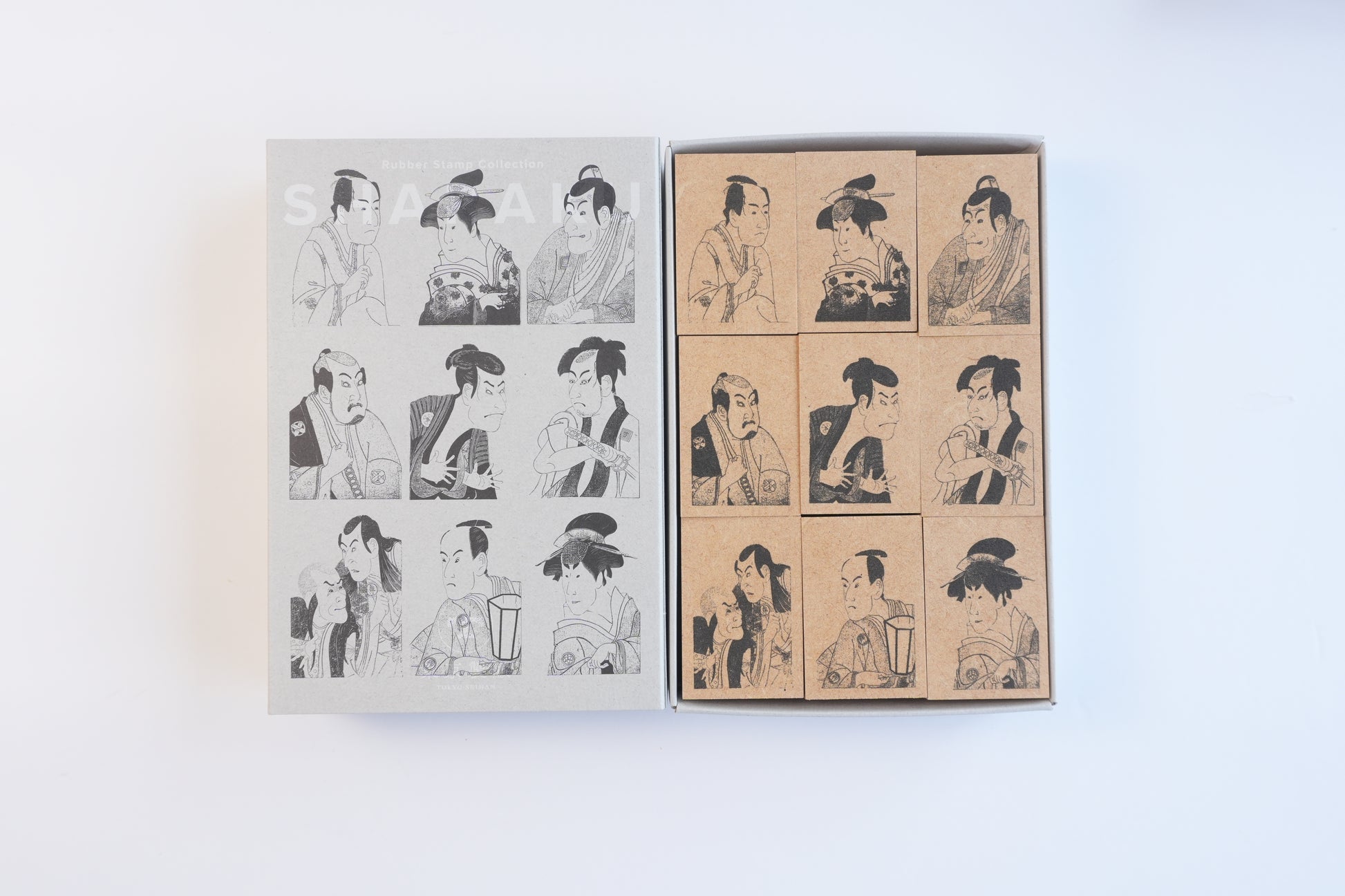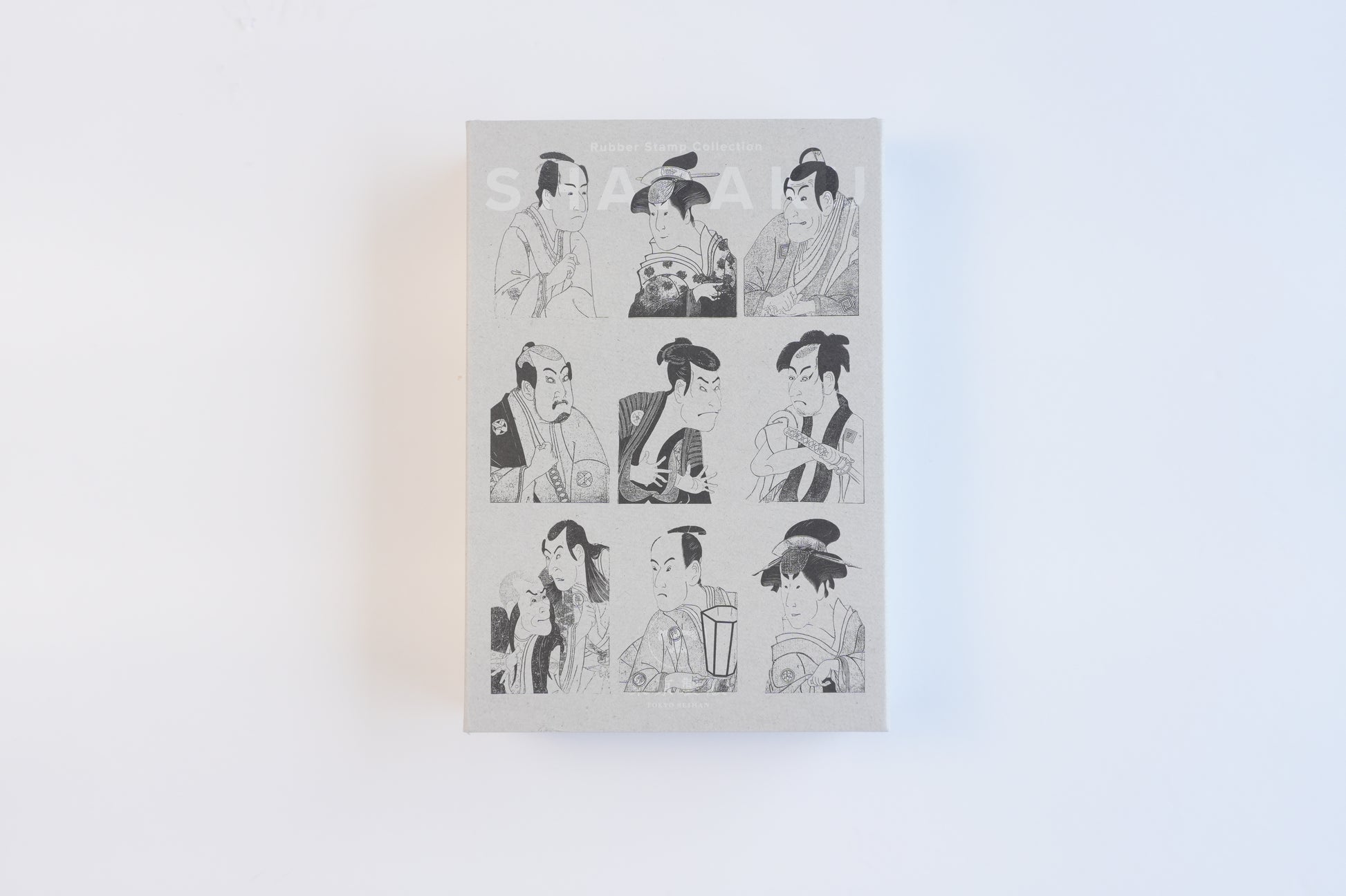 江戸の舞台の熱気を、そのままスタンプに。写楽の名を世に轟かせた歌舞伎役者の大首絵の中から、蔦屋重三郎との協働で生まれた話題作『恋女房染分手綱』を題材に、個性豊かな9点をラバースタンプに仕立てました。劇中人物たちの情念や動き、写楽独自の力強い表情を緻密な線で描き出し、まるで芝居小屋から抜け出したかのような存在感を放つコレクションです。